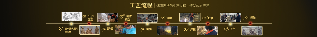 制作一件完美的鑄銅雕塑,最重要的步驟就是制作泥塑模型,然后再用工業(yè)硅膠拓印、翻模。所以泥塑的姿態(tài)、神情生動(dòng)與否直接影響最終銅雕塑的品質(zhì)。所以我廠一直對(duì)泥塑模型的制作格外重視。我廠以雕塑為本,以藝術(shù)為根,挾中華文化之傳統(tǒng),偕歐陸藝術(shù)之風(fēng)韻,風(fēng)格獨(dú)特,盡顯淋漓盡致。我們本著大膽創(chuàng)新、勇于突破的精神,以追求卓越為導(dǎo)向,堅(jiān)持寧缺勿濫為原則,并可依照您提供的要求,為您量身設(shè)計(jì)制作。我廠人才濟(jì)濟(jì),有智慧嚴(yán)謹(jǐn)?shù)墓芾戆嘧樱姸嗄贻p充滿激情、充滿創(chuàng)意的專業(yè)設(shè)計(jì)團(tuán)隊(duì)、有專業(yè)技術(shù)精湛的雕塑制作人才和專業(yè)的施工隊(duì)伍。他們不僅具深厚的文化藝術(shù)底蘊(yùn),更汲取當(dāng)代雕塑精華,博采眾家之長(zhǎng),作品既有嚴(yán)肅莊重寫(xiě)實(shí)題材,也有輕松前衛(wèi)的抽象題材,表現(xiàn)手法上浪漫主義中不乏樸實(shí),現(xiàn)實(shí)主義中蘊(yùn)涵著激情,設(shè)計(jì)理念貫穿古今、融匯中西,深刻詮釋著藝術(shù)的精髓,把古典主義和后現(xiàn)代主義完美的融合,將雕塑藝術(shù)演繹為力的凝聚、美的體現(xiàn),讓人們感受到的不僅是一種藝術(shù)的浪漫與優(yōu)雅、粗獷與悲壯、更是豐富的優(yōu)秀藝術(shù)寶藏和文化傳統(tǒng),讓您在藝術(shù)與文化中穿流,在時(shí)空中飄蕩,使靈魂在藝術(shù)的海洋洗禮。 MORE+